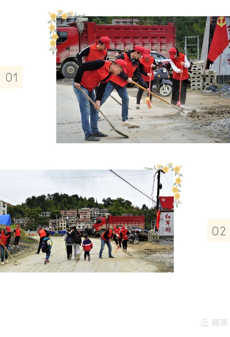 當(dāng)天,天巴三標(biāo)“紅馬甲”志愿服務(wù)者們來(lái)到長(zhǎng)洲鎮(zhèn),通過(guò)向群眾派發(fā)愛(ài)國(guó)衛(wèi)生月傳單以及現(xiàn)場(chǎng)講解宣傳冊(cè)等方式,傳播、強(qiáng)化“文明健康 綠色環(huán)保”的生活理念。由于近期持續(xù)降雨,百樂(lè)“紅軍村”的主干道泥濘不堪,影響當(dāng)?shù)厝罕姷某鲂校凹t馬甲”們充分發(fā)揮志愿者服務(wù)精神,積極作為清掃路面,現(xiàn)場(chǎng)黨旗飄揚(yáng),得到了周邊群眾的一致認(rèn)可。 |